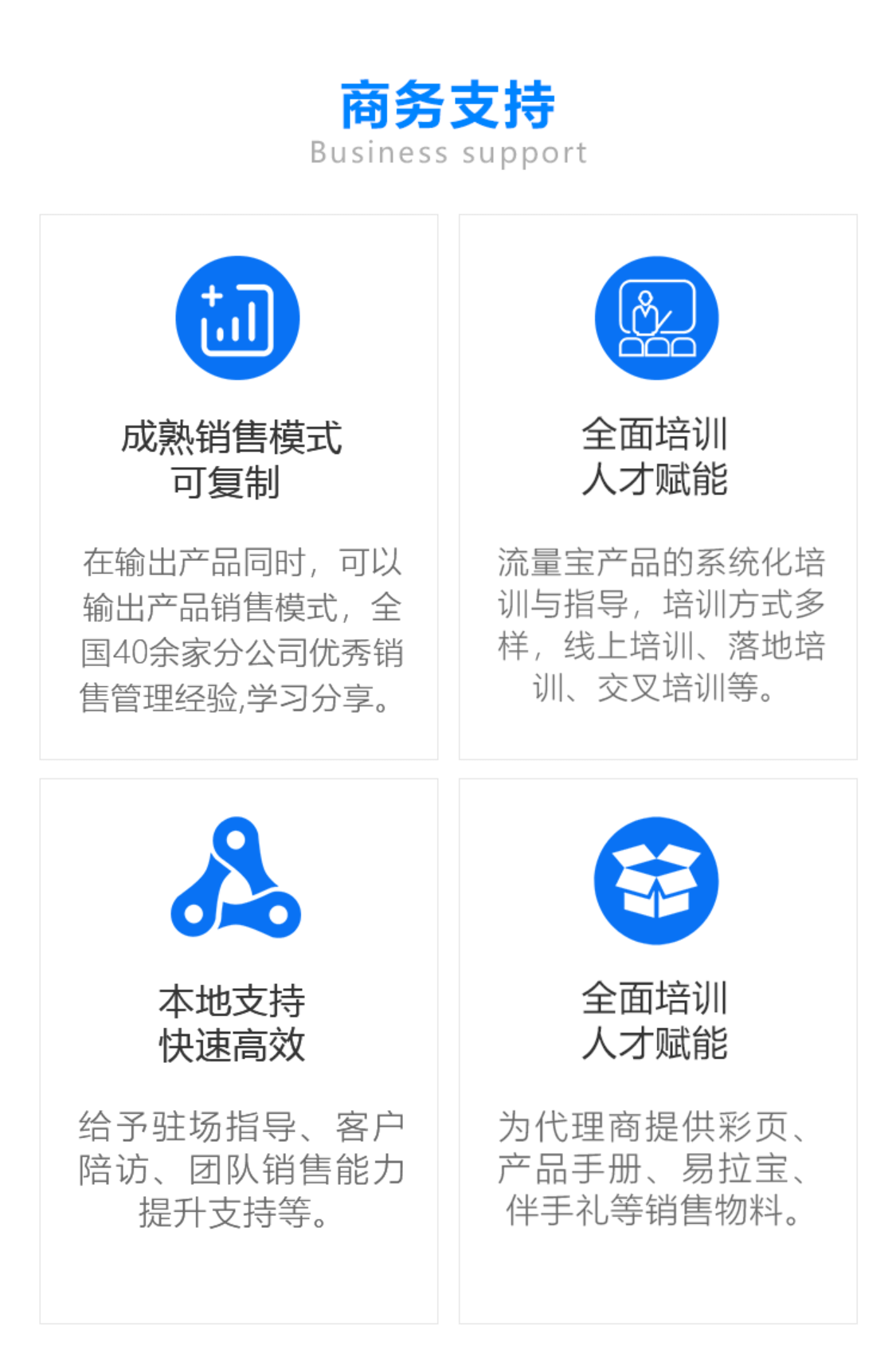 流量宝产品的系统化培训与指导,培训方式多样,线上培训、落地培训、交叉培训等。